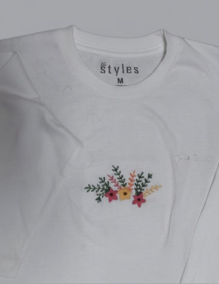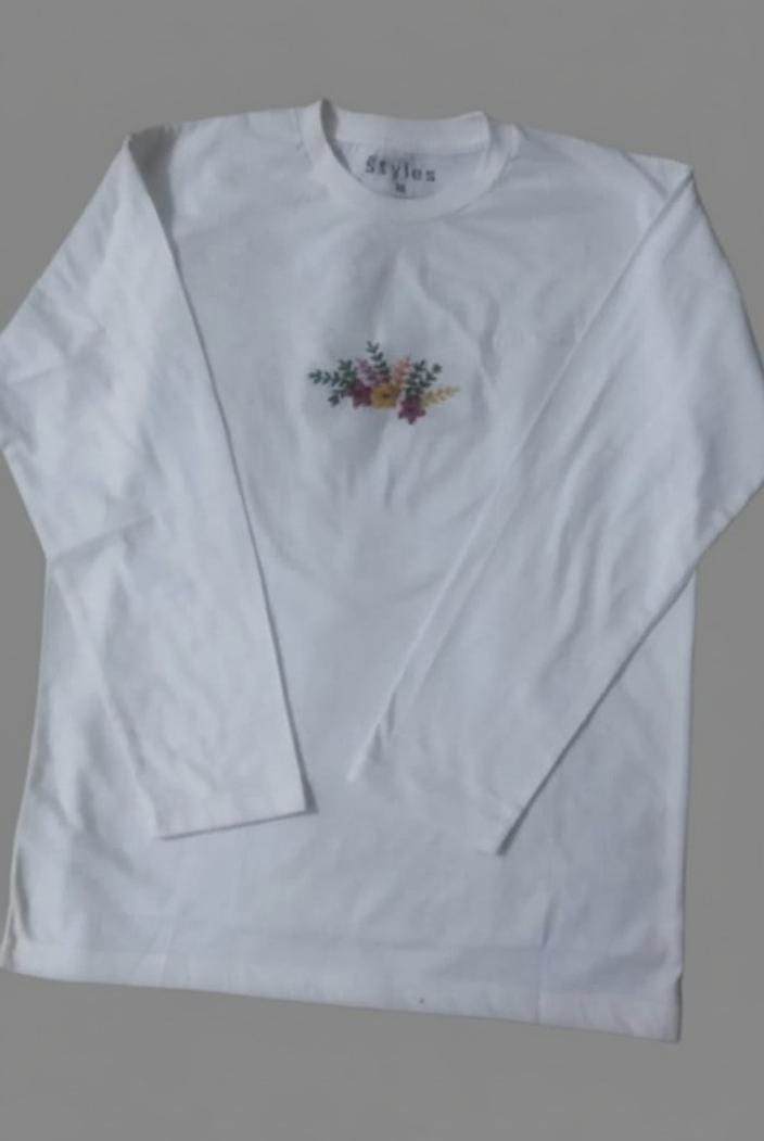 White Long-Sleeve Embroidered Floral T-Shirt